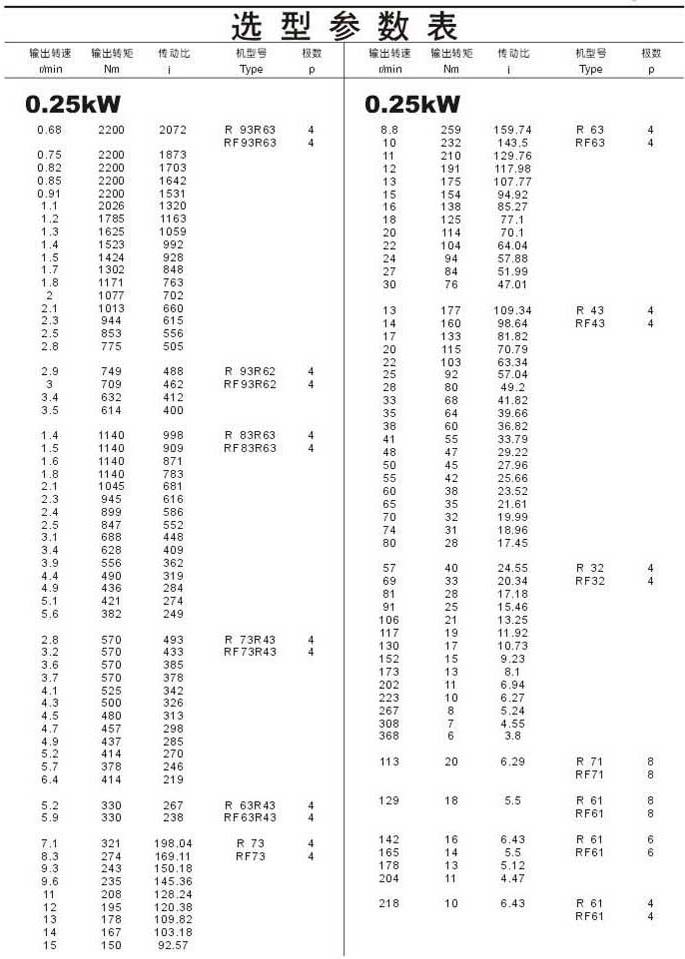 選型參數(shù)表0.25kW(續(xù))